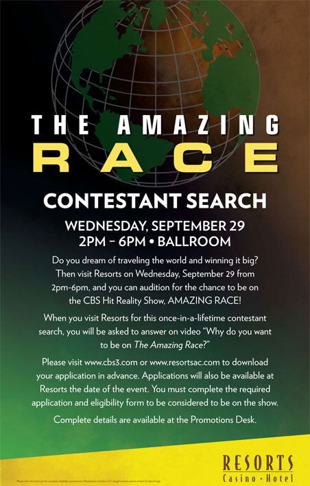 The Amazing Race is coming to recruit at the Jersey Shore! Auditions will take place this Wednesday, Sep 29, between 2pm-6pm in the Resorts ballroom in Atlantic City. When you visit Resorts for this once-in-a-lifetime contestant search, you’ll be asked to answer on video “Why do you want to be on The Amazing Race?”