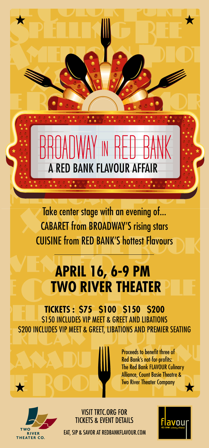Red Bank Flavour, a culinary campaign driven by the borough’s top chefs, restaurateurs and proprietors, announced its partnership with Two River Theater to present Broadway in Red Bank on Monday, April 16. The event will take place at the Two River Theater and include a palatable selection of cuisine from Red Bank’s hottest restaurants and a must-see cabaret performance featuring Broadway’s rising stars. Tickets ranging in price from $75-$200 are on sale now from www.trtc.org.