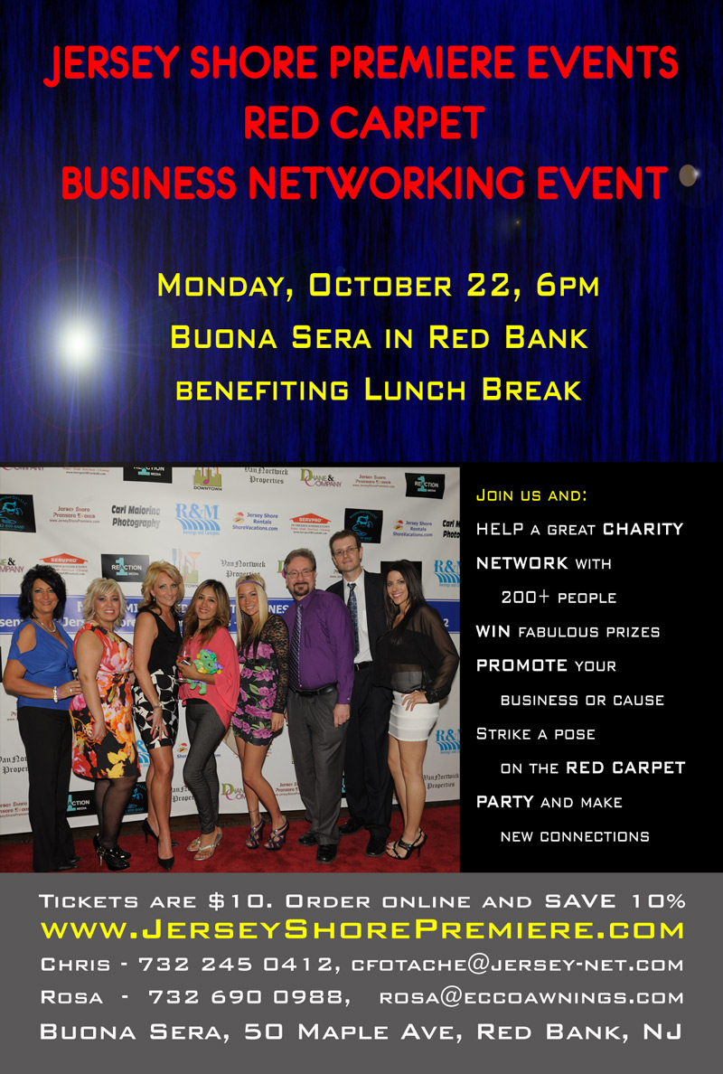 Jersey Shore Premiere Events is hosting a red carpet business networking event on October 22nd, at Buona Sera in Red Bank, beginning at 6:00pm. Part of the proceeds will benefit Lunch Break, the local soup kitchen.