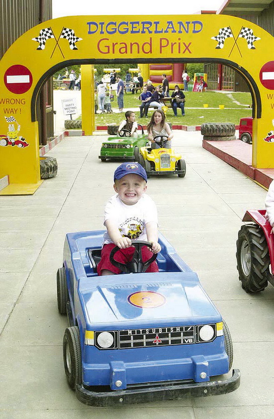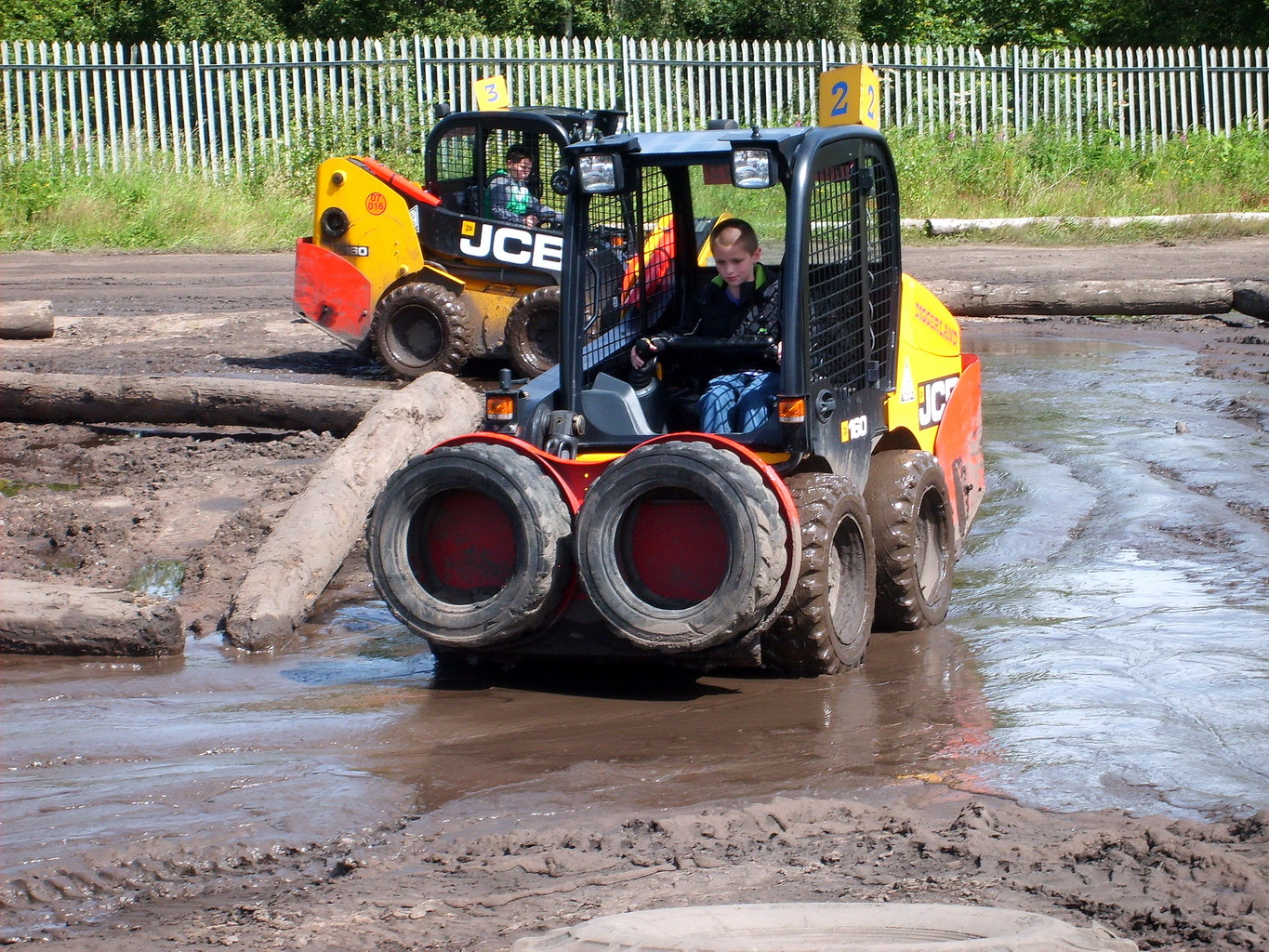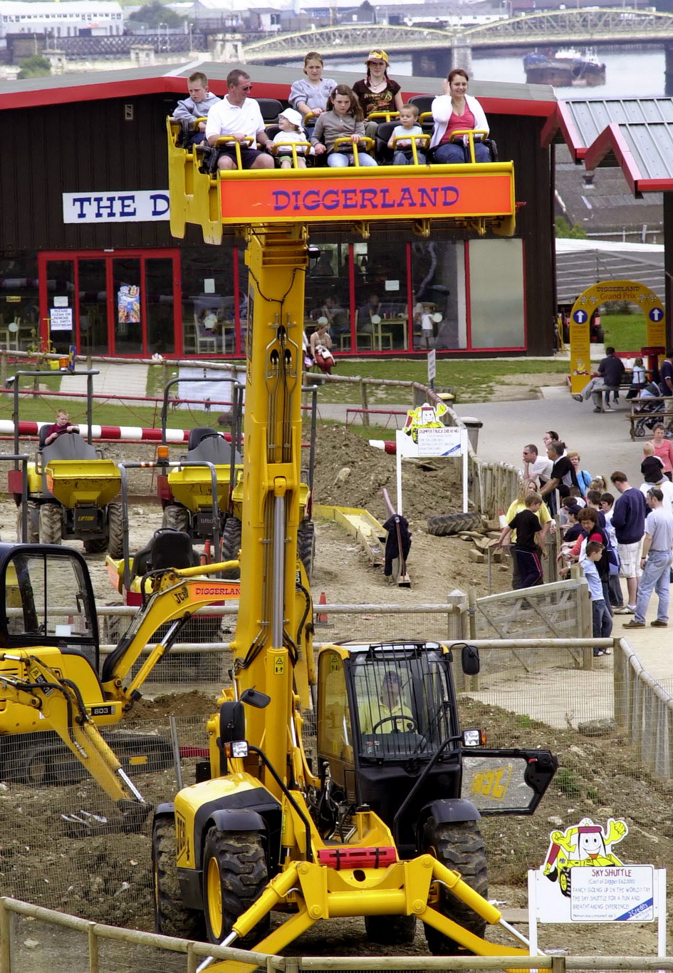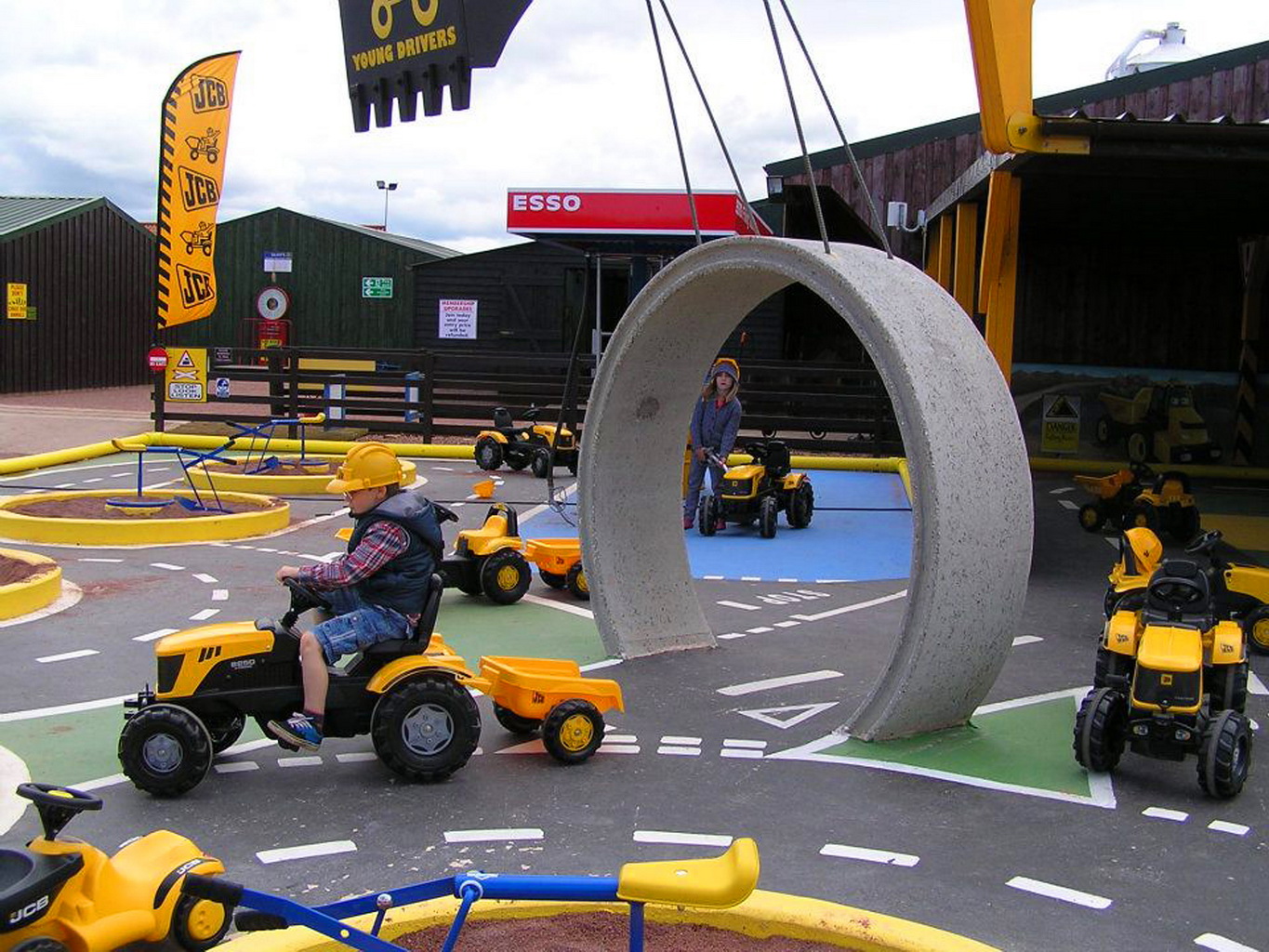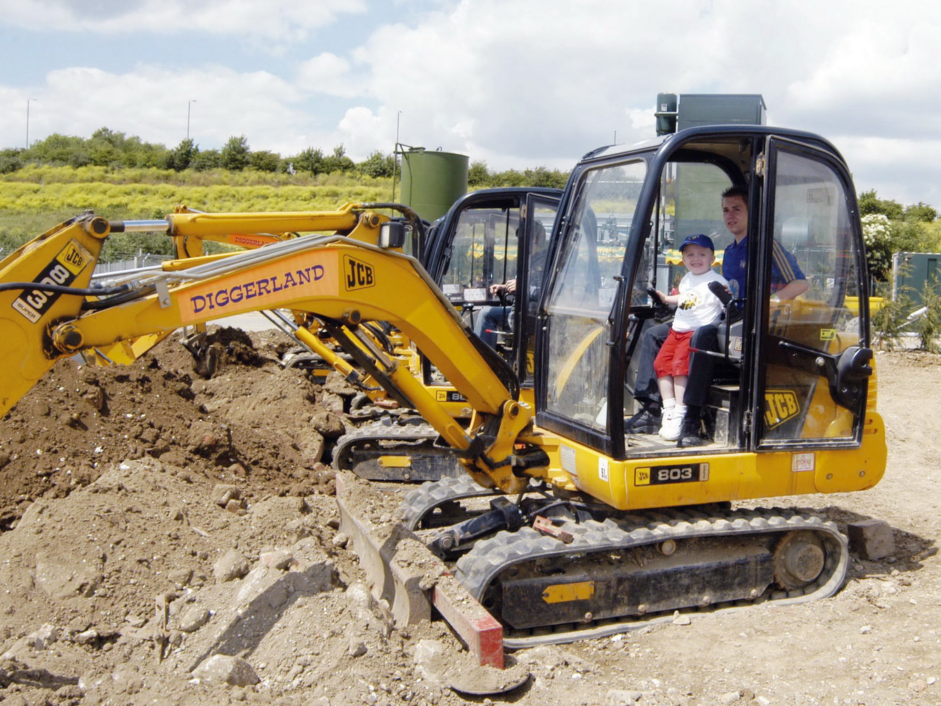 Diggerland incorporates the hands on operation of machinery for the entire family. Children and parents alike have the opportunity to drive skid-steer loaders, backhoes, tractors, mini dumpers, and small excavators. All the equipment has either been modified for use on a course or made stationary by design for operation in designated excavation areas. An amusement engineering marvel and staple attraction for the park, Spin Dizzy, booms the arm of a 20 ton JCB JS220L excavator up and down while spinning in circles with 8 passengers harnessed into the seats of a modified bucket attachment. In The Backhoe Adventure, 4 riders and a ride marshal climb aboard the cab of a modified JCB 3CX backhoe for a mystery tour while taking turns behind the wheel of the machine.