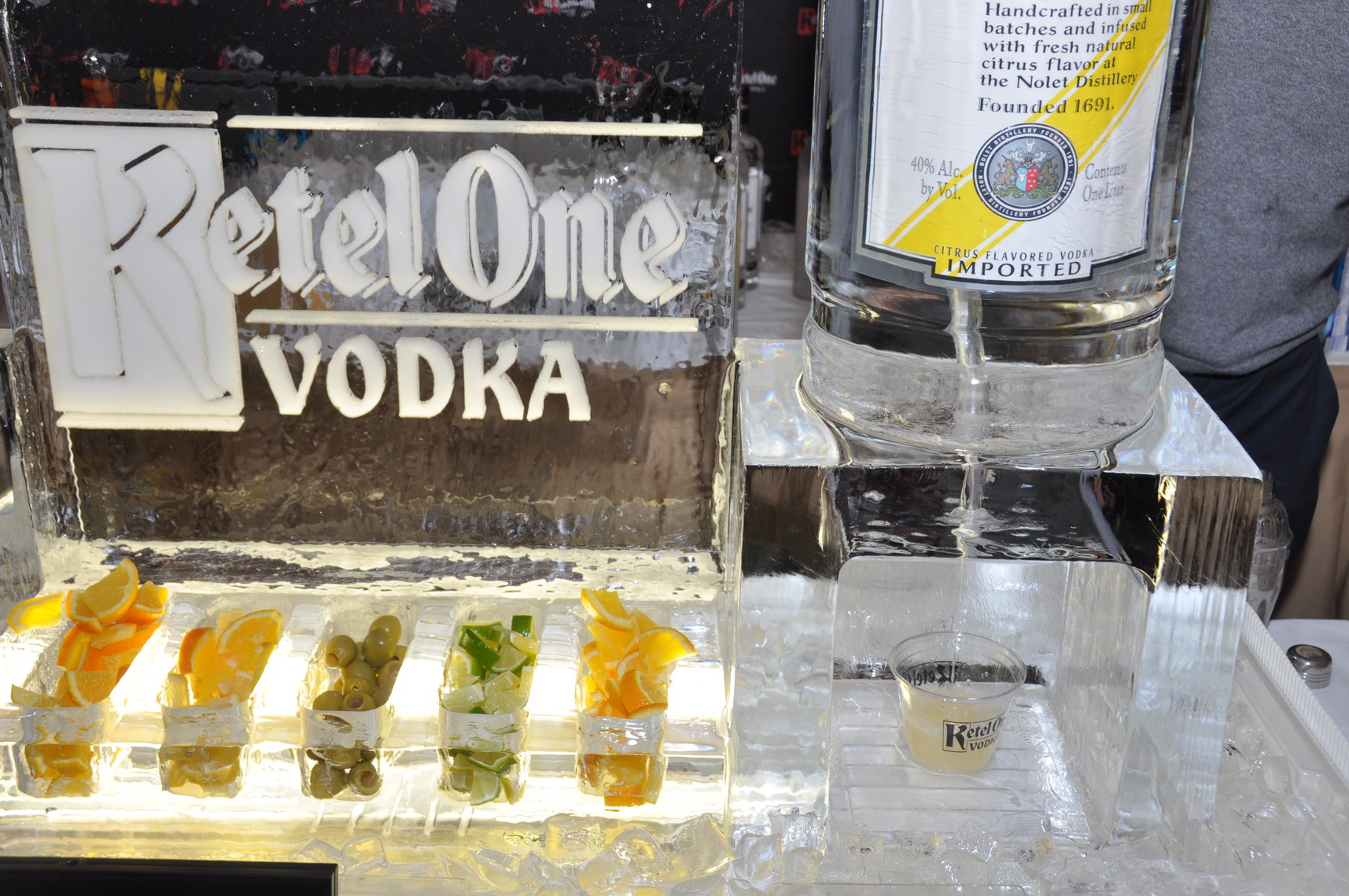 This time, I really enjoyed the varied liquor offerings. Almost the centerpiece of the main room was Ketel One‘s display with its two giant bottles framing what looked like an ice sculpture. A team of “bartenders” were pouring the fine vodka down a long twisted slide which filled the glasses at the bottom. I had a lemon flavored one, and had to return later to try the orange as well.