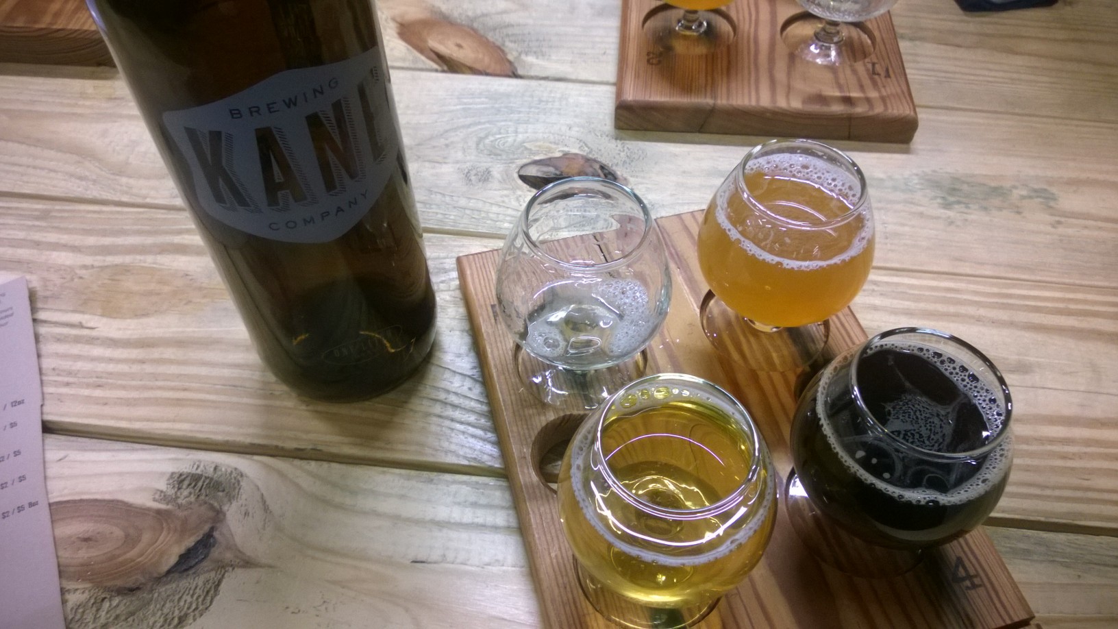 Going in the winter, I was a bit disappointed by the smaller offering. Haven’t been there since summer, when they were having about 8-10 beers on top, to choose from. This time they only had 4, and as their tasting flight has 4 glasses, there’s really no choice (in case there’s some beer you don’t like). Kane gives you some nicely-sized samples, and you get 4 glasses (about 4oz each) for $6. The ones Kane had on tap were: