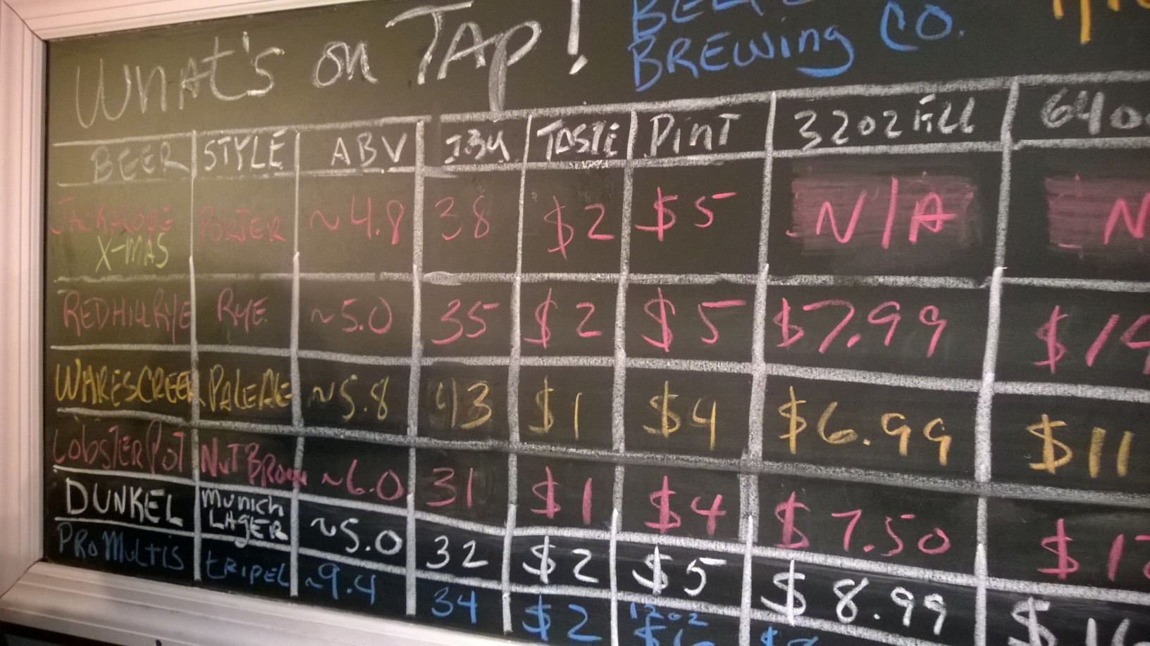 The tasting room is open Friday evening 6:30-8:30 and Saturdays 1-5pm. You can taste a full school for $10, order a pint for $4-5, or fill your growler with your favorite. They also do tours of the brewing area, which is right next to bar. You can get updates about their opening hours and beer offerings from the Belford Brewing Facebook page.