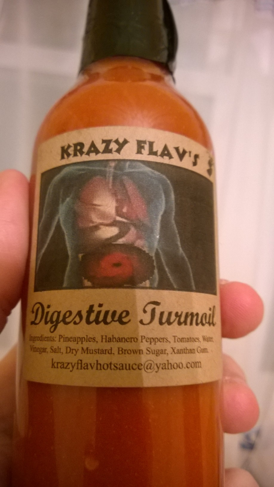 Mango Erruption: Has crushed red peppers and mango. As a mild sauce, it has enough of a bite, and it still feels spicy. Too many artisan mild sauces have a flavor so strong that you don’t feel the heat anymore.- Digestive Turmoil: Made with habanero and pineapple, this sauce definitely has a scary name. I should said it didn’t live up to its name (which is good, in this case), but it’s a great sauce. It is very hot, but you can still taste the fruit. My favorite of this batch.