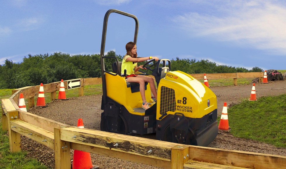 The double drum rollers, manufactured by Wacker Neuson, are bitesize versions of the massive asphalt rollers one might associate with highway construction. The RD12 models, making a new home at Diggerland this year, are one-ton hydrostatic vibrating rollers featuring front drum vibration and articulated steering.